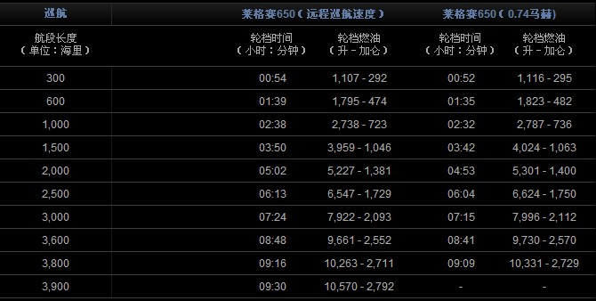 輪擋時間及輪擋燃油 4名乘客,2名駕駛員,每人以200磅(91公斤)計,國際標準大氣,無風,符合NBAA IFR規(guī)定的備份燃油條件。(200海里備降距離)。起飛條件:海平面、國際標準大氣、最佳起飛重量 最大使用速度