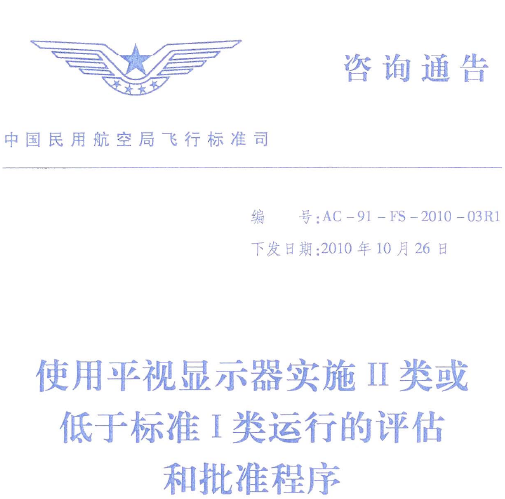 藍(lán)天飛行翻譯公司承接中國民用航空局飛行標(biāo)準(zhǔn)司的使用平視顯示器實(shí)施II類或低于標(biāo)準(zhǔn)I類運(yùn)行的評(píng)估和批準(zhǔn)程序咨詢通告翻譯任務(wù),編號(hào)AC-91-FS-2010-03R1 Advisory Circular Translation
