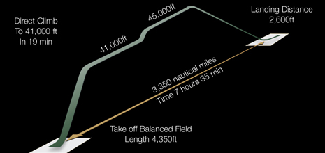 Performance 性能 Falcon performance 獵鷹性能 機會就在眼前。2000S有直飛3,350海里無需加油的續(xù)航能力, 有無與倫比的飛行速度和靈活性,以及舒適寬大的客艙,其誘人的魅力無法阻擋。 Go direct 直飛 With its certified altitude of 47,000 ft and its power to climb directly to 41,000 ft, the Falcon 2000S takes you above most traffic and weather. And it can fly 3,350 nm nonstop. Due to its excellent short field capabilities, you can take off and land at smaller, more convenient airports. 獵鷹2000S具有47,000英尺的最大認證高度,直接爬升41,000英尺,不費吹灰之力。獵鷹2000S能帶領乘客穿云破霧,突破各種航行和氣候條件限制,即使連續(xù)飛行3,350海里也無需停靠。加上完美的小場地操控性能,可更好地起飛降落各類機場,為您提供更多便捷服務。 ![]() 達索獵鷹2000S公務機直飛 Expanding your horizons 擴大您的視野 從北京到新加坡,從香港到孟買,從成都到雅加達無須中途?俊<词勾┰絹喼拗钡綒W洲的飛行任務,也僅需?恳淮尉湍軋A滿完成。獵鷹2000S本身就是一個經(jīng)典杰作。 BFL at MTOW: SL - ISA 4,325 ft 1,318 m