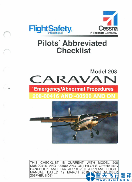 北京藍(lán)天飛行翻譯公司承接大型通航公司的塞斯納208簡(jiǎn)易檢查單翻譯任務(wù),塞斯納208簡(jiǎn)易檢查單包含有正常程序和應(yīng)急/非正常程序,Cessna 208 CARAVAN Pilots’ Abbreviated Checklist Translation