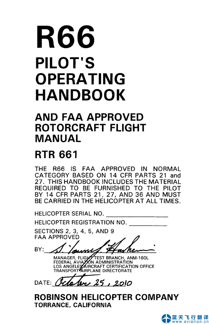 完成通用航空公司的羅賓遜R66飛行員操作手冊翻譯任務