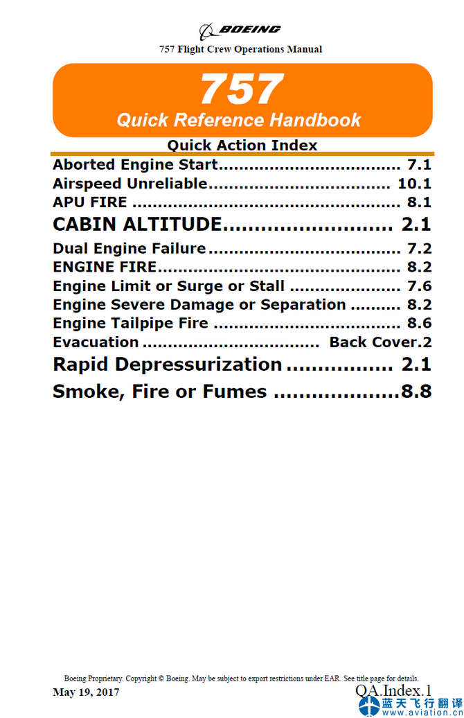 北京藍(lán)天飛行翻譯公司完成大型航空公司2017年5月19日版本波音757機(jī)組使用手冊(cè)和757快速檢查單翻譯 757 Flight Crew Operations Manual and 757 Quick Reference Handbook Translation Revision Date: May 19, 2017 ![]() 757機(jī)組使用手冊(cè) 757 Flight Crew Operations Manual ![]() 757快速檢查單 757 Quick Reference Handbook |
