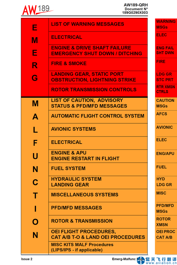 AW189直升機(jī)快速檢查單(Quick Reference Handbook(QRH))的主要內(nèi)容包含有:
