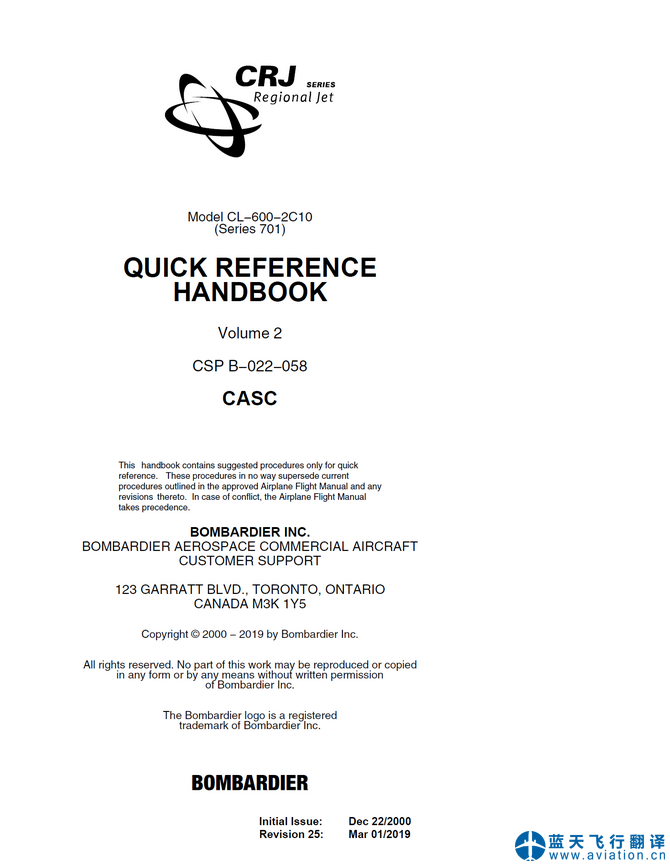 本次翻譯的CRJ700快速檢查單為第25版,2019年3月1日版本,分為上下兩冊(cè)。Model CL−600−2C10