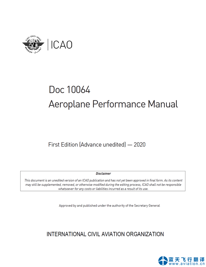 北京藍(lán)天飛行翻譯公司承接國際民航組織飛機性能手冊翻譯任務(wù) INTERNATIONAL CIVIL AVIATION ORGANIZATION, Aeroplane Performance Manual Translation