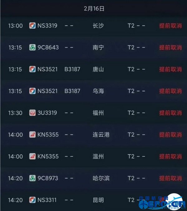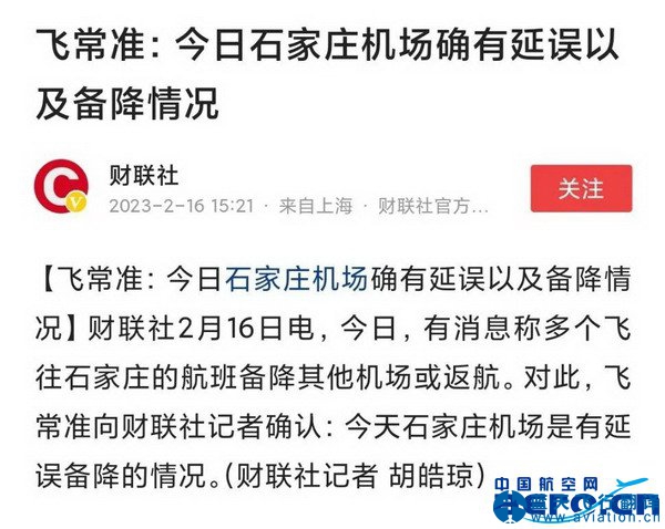 2月16日,有消息稱中午前后多個飛往石家莊的航班備降其他機(jī)場或返航。有網(wǎng)友稱是大霧原因,還有網(wǎng)友稱石家莊上空全部都是軍機(jī)。